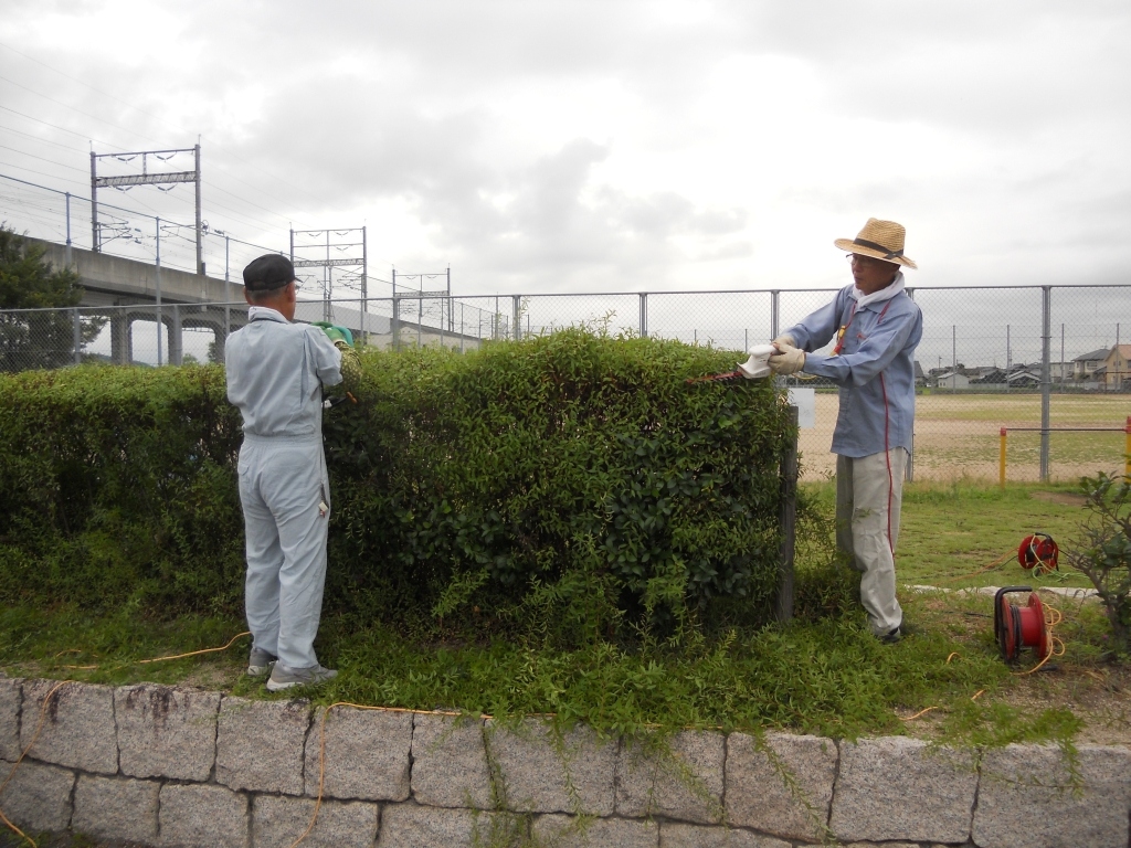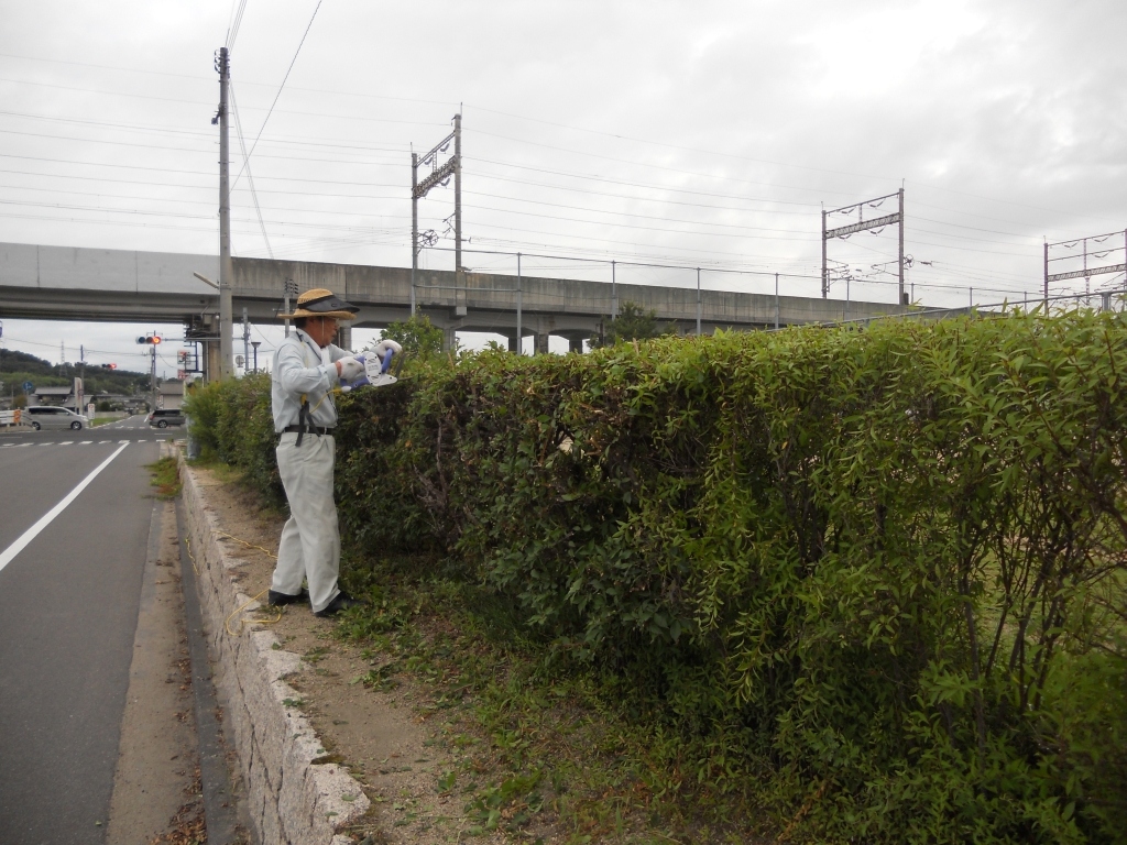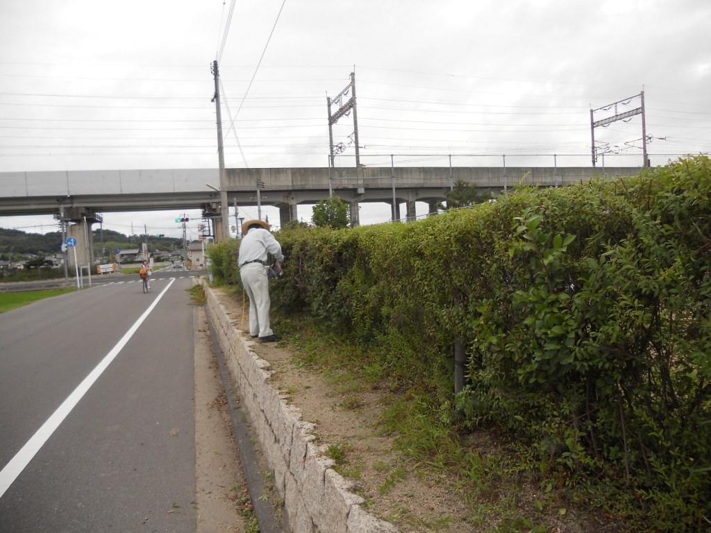 写真の奥の方では、刈り取った生垣の葉をゴミ袋へ入れてます