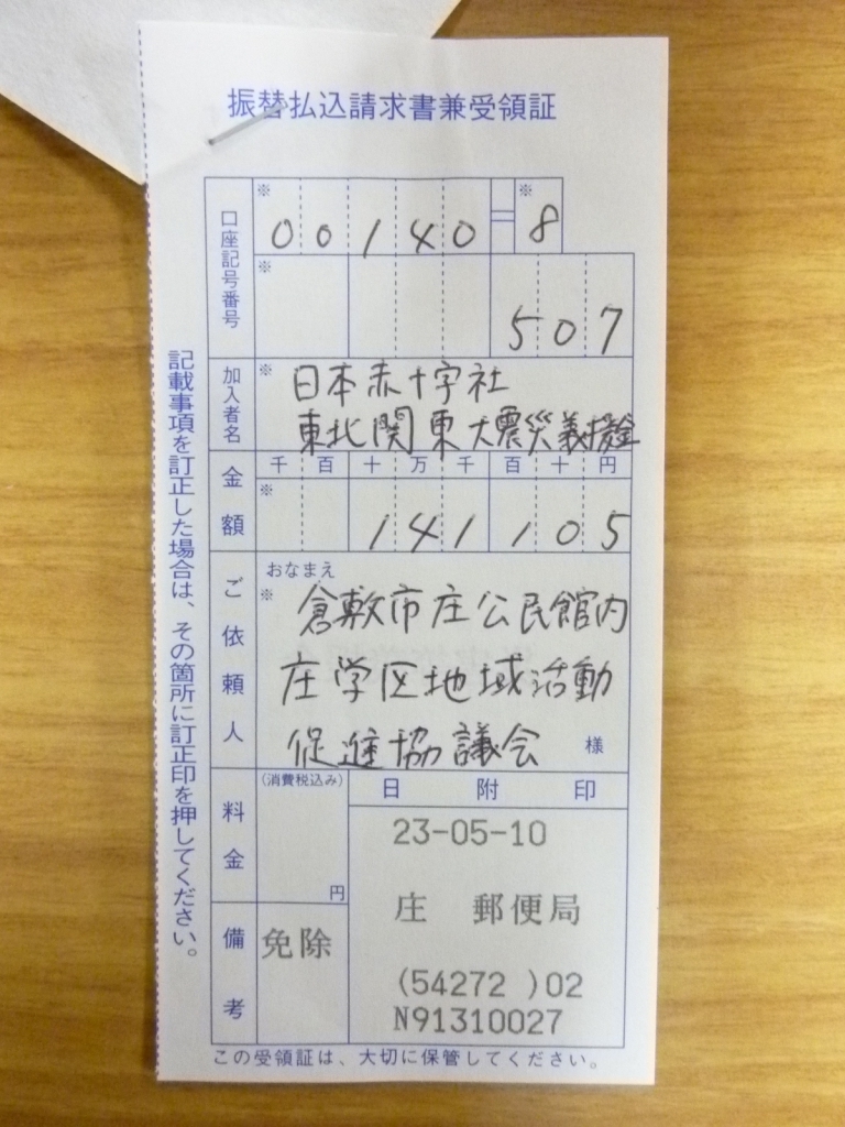 庄郵便局から「日本赤十字社・東北関東大震災義援金」に入金しました